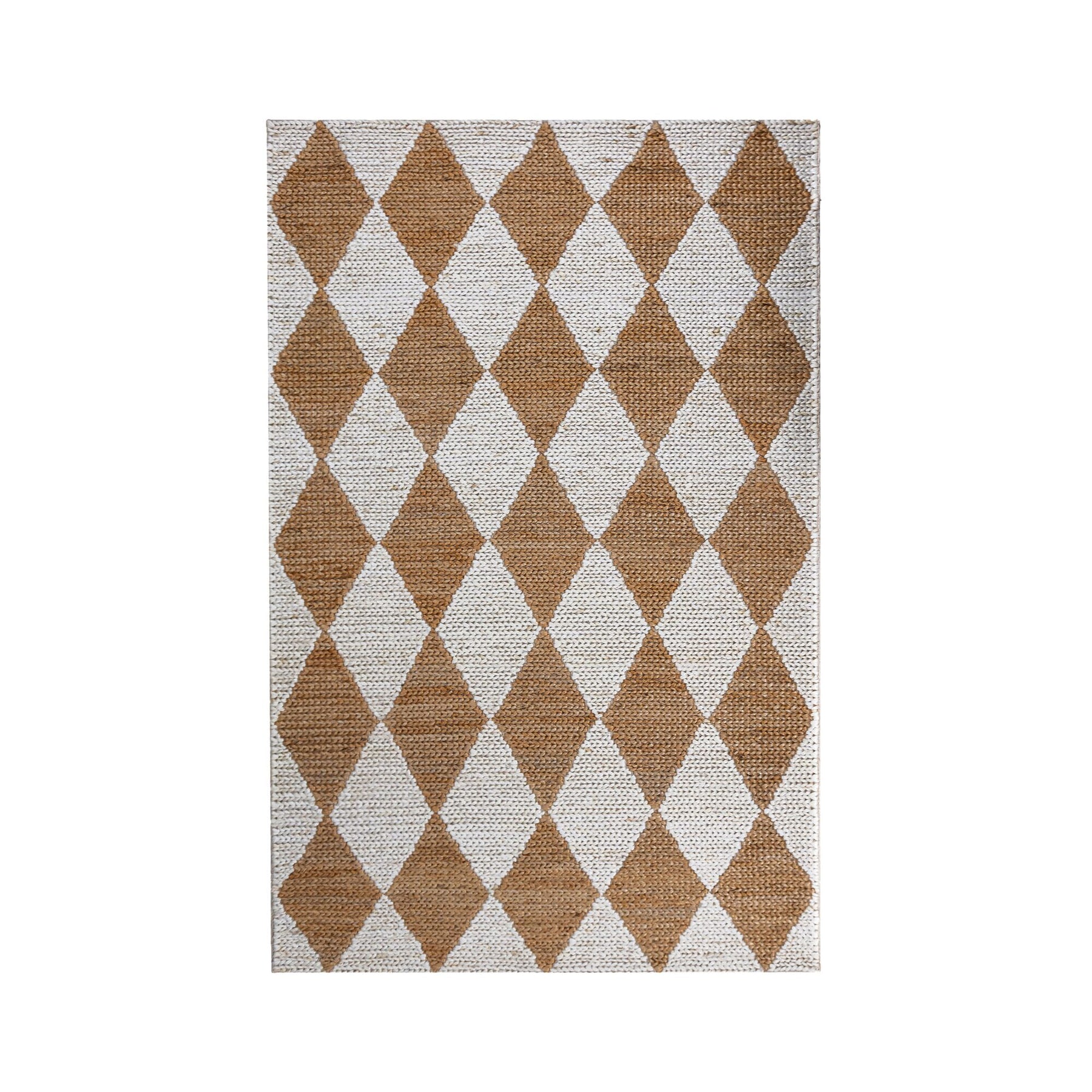 Entièrement fabriqué à la main en 100 % jute durable, il présente un tressage épais qui met en valeur ses tons naturels et son motif de losanges oversize inspiré de l’Arlequin.